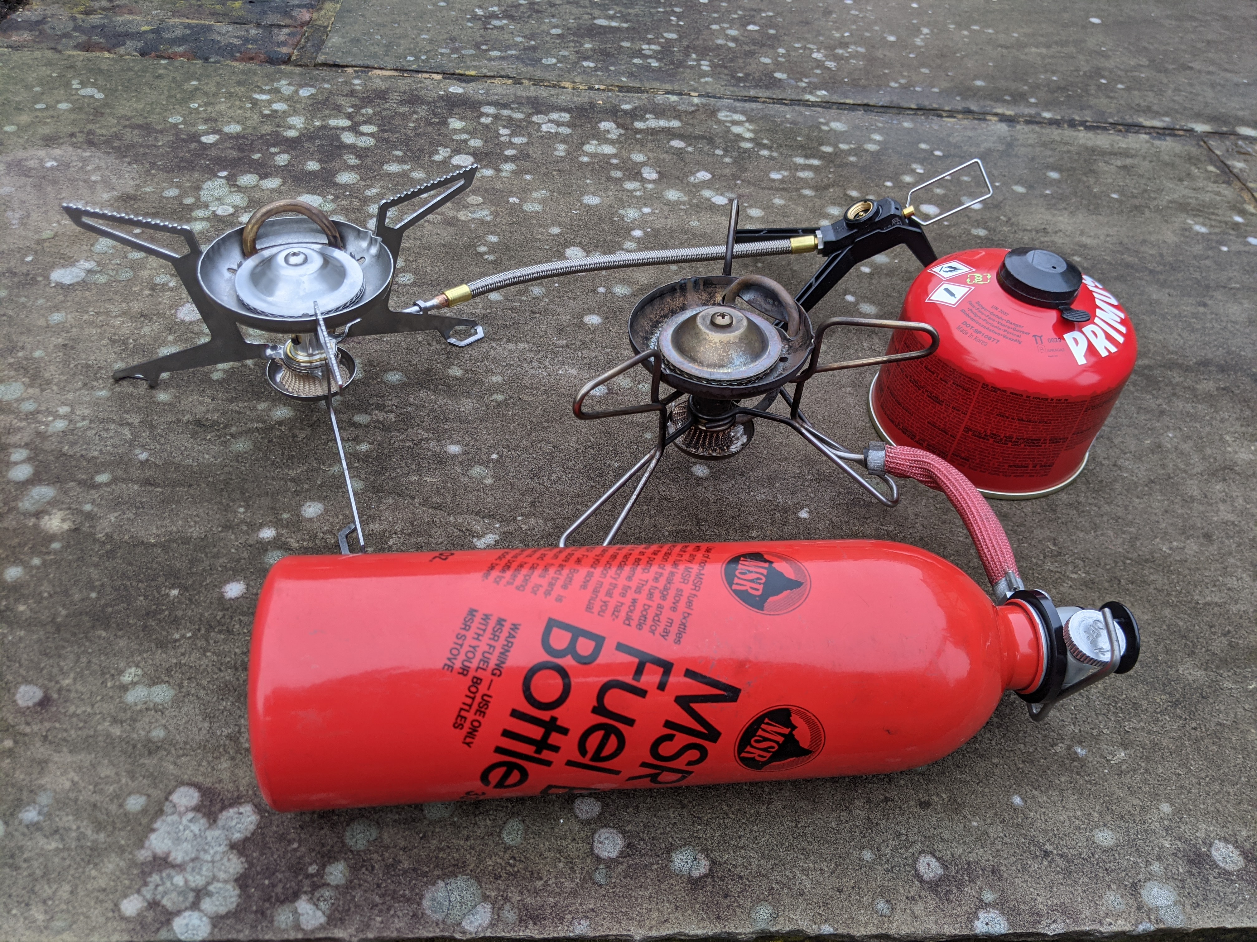 My Alpkit Koro gas stove has been in my backpack or cycle panniers for at least five years. It replaced the Trangia unit, which is just too heavy. It is matched to a range of cookware, primarily the Alpkit HAAP pot, pan and a kettle or a lightweight titanium mug, depending on my cooking ambitions. Buying gas canisters is usually not a problem, but they are expensive if you do a lot of cooking and need to be disposed of carefully when empty. So I decided to renew my interest in the MSR Whisperlight stove a friend gave me in the late 1980s. I donated the Trangia units to the local scout group, except the Trangia Mini, which I used for many years.