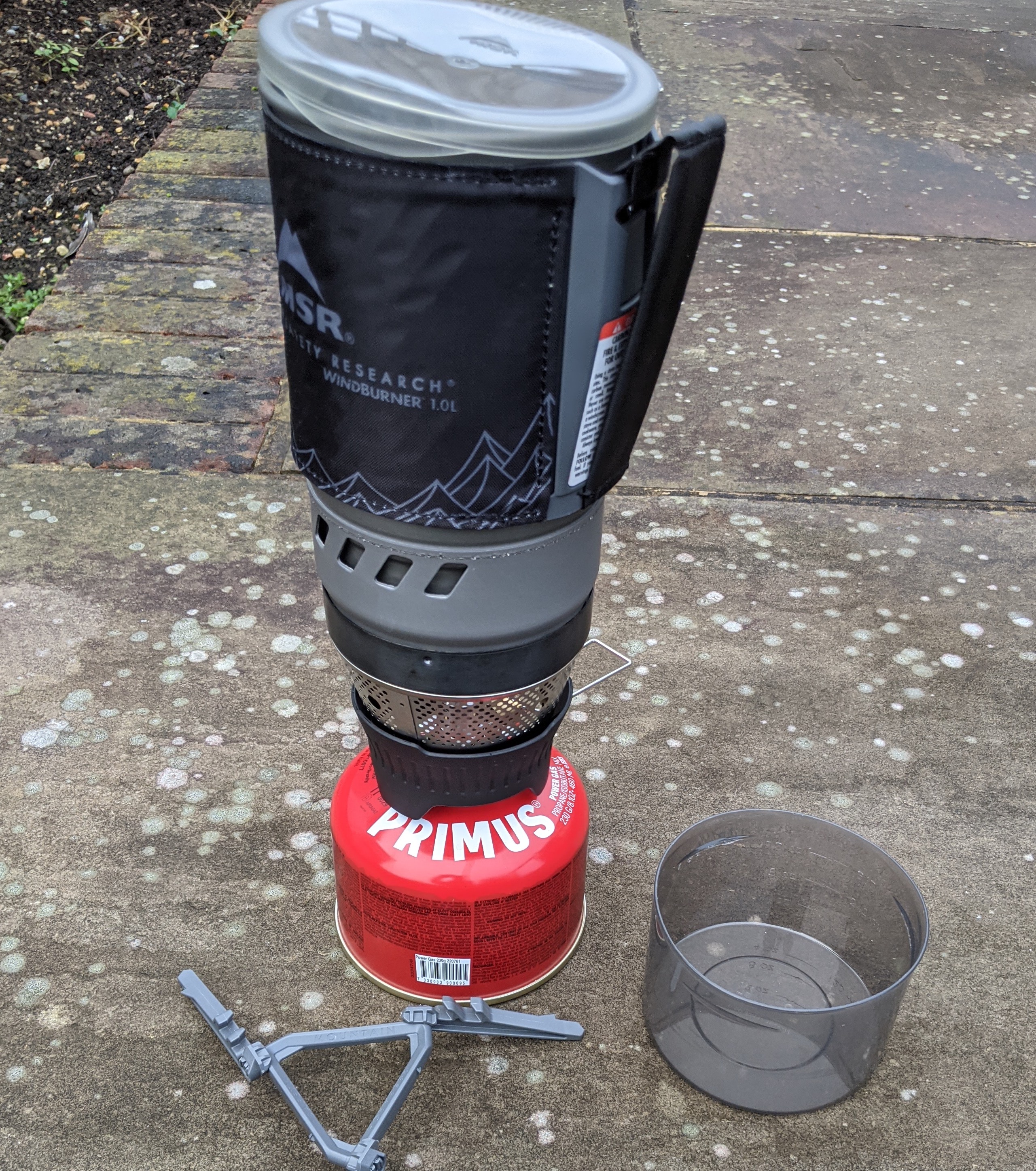 Add about 100g for a small gas canister (empty) or 150g for a medium size (empty). Fuel weight, add a further 110g and 230g, respectively (full). I have excluded the Trail Design Ti-Tri as it weighs less than the Alpkit windshield.
