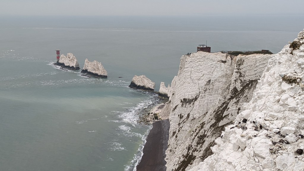 Huge Chines (water cut steep gorges) cut into the crumbling coast, requiring detours. The soft soil erosion is extensive over huge cliffs, more than I have ever seen. It is horrifying to see sections of paths crumble and broken below – so I keep a healthy distance from the edge. I walk inland to the quaint village of Brighstone and catch a bus to Newport to see friends that evening, before returning again to walk the chalk cliffs to Freshwater Bay and ascend on to Tennyson Down.