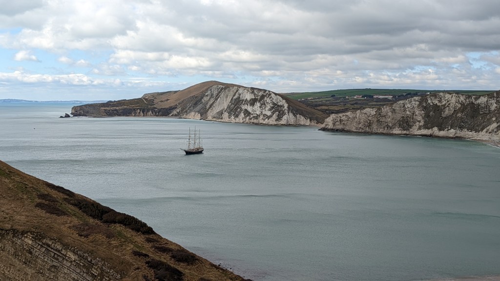 I timed my departure at Chichester to schedule the arrival at the Lulworth Ranges for the weekend. The walk to St. Aldheim’s Head is muddy but compensated for by the tremendous coastal vista ahead. There is no doubt I am on the SWCP now and walking it for the second time in the opposite direction. As I study the map I search for any place name ending in combe, for this signals a seriously steep descent and ascent, which has woken my legs from a flatland slumber. Even as I reach the oil rig at Kimmeridge and slide through the open gate on to the military ranges. Now it is severe walking and stunning coastal landscapes. A tall ship anchors in Worbarrow Bay, and for a moment I am transported back to the 18th Century, the view would have been identical. It is busy with walkers, and one team of ultra-runners who are researching the route for an upcoming race. I walk with them for a while to exchange intelligence on landslips and diversions. I am exhausted but exhilarated to reach Lulworth Cove and camp at Durdle Door. The easterly still has a freezing cold bite, but I sleep well after a good meal to restore the fuel used on a 22-mile tough day.