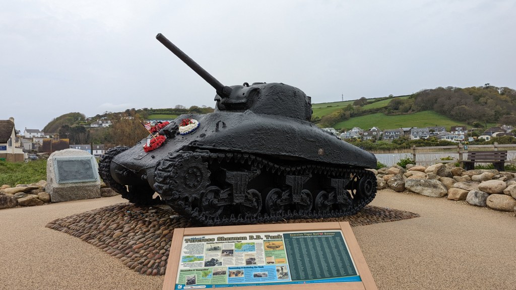 I cross the River Dart to camp at Stoke Fleming, delayed by many opportunities to stop and talk to other coastal walkers heading to Dorset. One retired Army officer spends half an hour talking about the wartime tragedy of Slapton Sands, he actually met the American soldiers confined to barracks to prevent news of the calamity from spreading before D-day. The next day I walk those sands and stop for a moment at the tank memorial at Torcross to read the names of those that died. It is a long list.