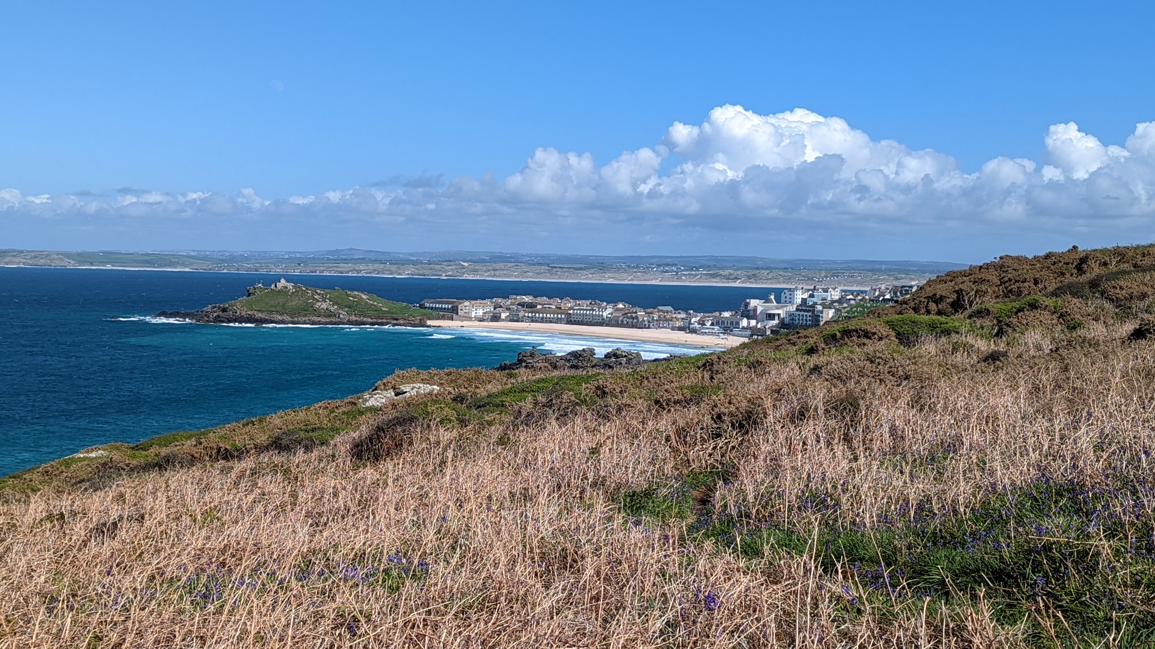 My intent now is to walk to Pendeen Watch and camp, but the campsite is a bit grim and offers little protection from the strengthening winds. I walk on to Morvah, but the advertised campsite is a pop-up site now closed post-pandemic when demand for staycations rocketed. I try to catch the coast bus back to St Just, but a notice on the sign announces it is not running on the very day I want to use it! My luck is down, so I stick out my thumb and the first car stops to give me a lift to a great site at Botallack. The bus returns me to Morvah for a final 13-mile walk into St. Ives, in heavy rain at first, and then glorious sunshine. I meet an unexpected number of coastal walkers and spend at least an hour chatting. The hostel at St. Ives is quirky and great, an oasis in an increasing tourist Disneyland. The gulls and pigeons are real pests and kind of run the place.