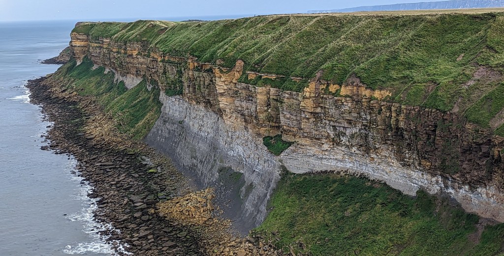 It is good to be back on the beach walking into Salturn for a mandatory fish and chips. The Yorkshire moors fall into the sea, and I am climbing again along 200m sea cliffs. These are the first I can recall since Somerset. My knees are making strange noises, but the exhilaration of the elevated views, particularly at Boulby, minimises any pain. I descend into Staithes and climb to Hinderwell for an excellent campsite. I have been walking with several groups on day hikes using buses to return to their start points. The conversations delay progress in a nice way, as does a long chat in the campers’ room with others passionate about walking in the area. The Cleveland Way will be a highlight, and it seems pretty different from how I recall walking in the opposite direction some 7 years ago.
