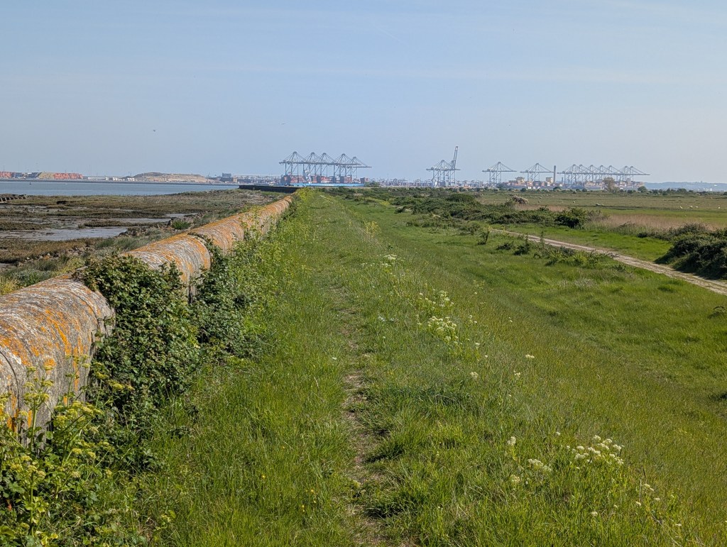 It took me almost two hours to drive to the Isle of Grain, somewhere I could see easily from Canvey. Crossing the Dartford Bridge to Cliffe, I could park and walk around the new KCIIIECP path from the fort to Allhallows-on-Sea. I would have continued on to Grain and Strood, but time did not permit. Nevertheless the sea wall route was superb, with even more cuckoos calling and lengthy warbler concerts in play, amongst the world war explosive factory buildings and gravel pits. The sea wall is remote, and I did not expect to see anyone, until I met Gary and Helen, also KCIIIECP walkers heading for Gravesend, and then another pair, Tim and Jane, walking the coast on a sponsored walk.