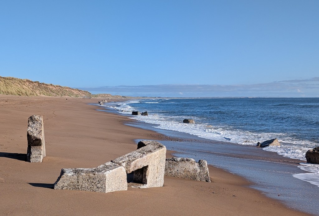 Edging my way around the narrow sandcliff alongside the River Don, I was anxious about the tides, military ranges and soft sands to Newburgh, but I need not have worried. This is a glorious golden beach, with barely a soul on it, save for a lone mudlarker, collecting crockery and seaglass from the shoreline. His collection invites me to do the same and it is not long until I find a large piece of green seaglass which will find its way back to my writing desk in a week or so. It takes a good three hours to reach the bus stop in Newburgh village, to conclude a half-day to syncronise my schedules with accommodation further north. I rest a while before the hourly service, and take time to watch several hundred seals on the opposite riverbank. They are joined by several hundered eider ducks, taking a moment in the shelter of the river. This is an important breeding area, to the extent that orcas will pay a visit a few months after the pups are born. A local tells me they have been active this summer.