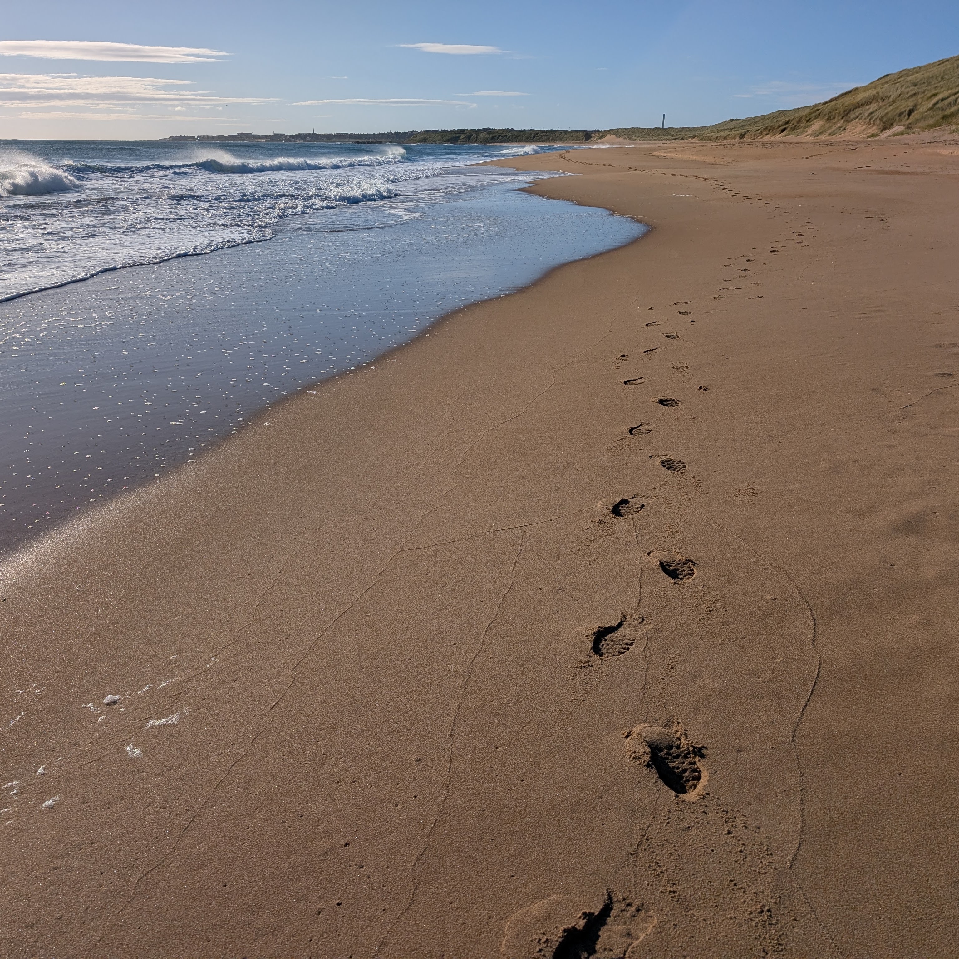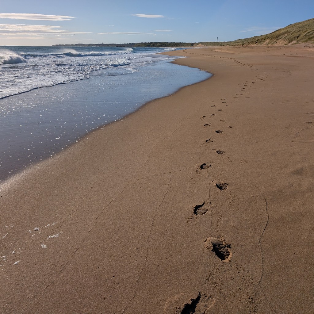 A good breakfast is needed for today, for I am about to walk some 30km to Fraserburgh, along what I consider to be the longest walkable beach in the UK. After crossing the memorial bridge, a vast arc of golden sand opens for the first 8 miles to Rattray Head, punctuated by the dramatic lighthouse, perched on The Ron rock outcrop. The walking so far has been easy going, with the exception of some soft sands, but as I turn the corner, I face a strong headwind which has been building slowly since 11AM.