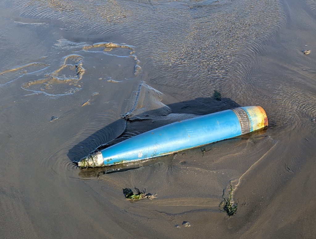 Be prepared to get wet feet, as you have to cross shallow channels and puddles, stiched together with seagrass, which the Brent Geese have flown in for from Siberia. It is a joy to see these winter birds, the gurgling sound they make will be a feature of the estuary for a few months. The walk came across two unexploded shells, which everyone seemed casual about, but they are the real deal and shouldn’t be touched.