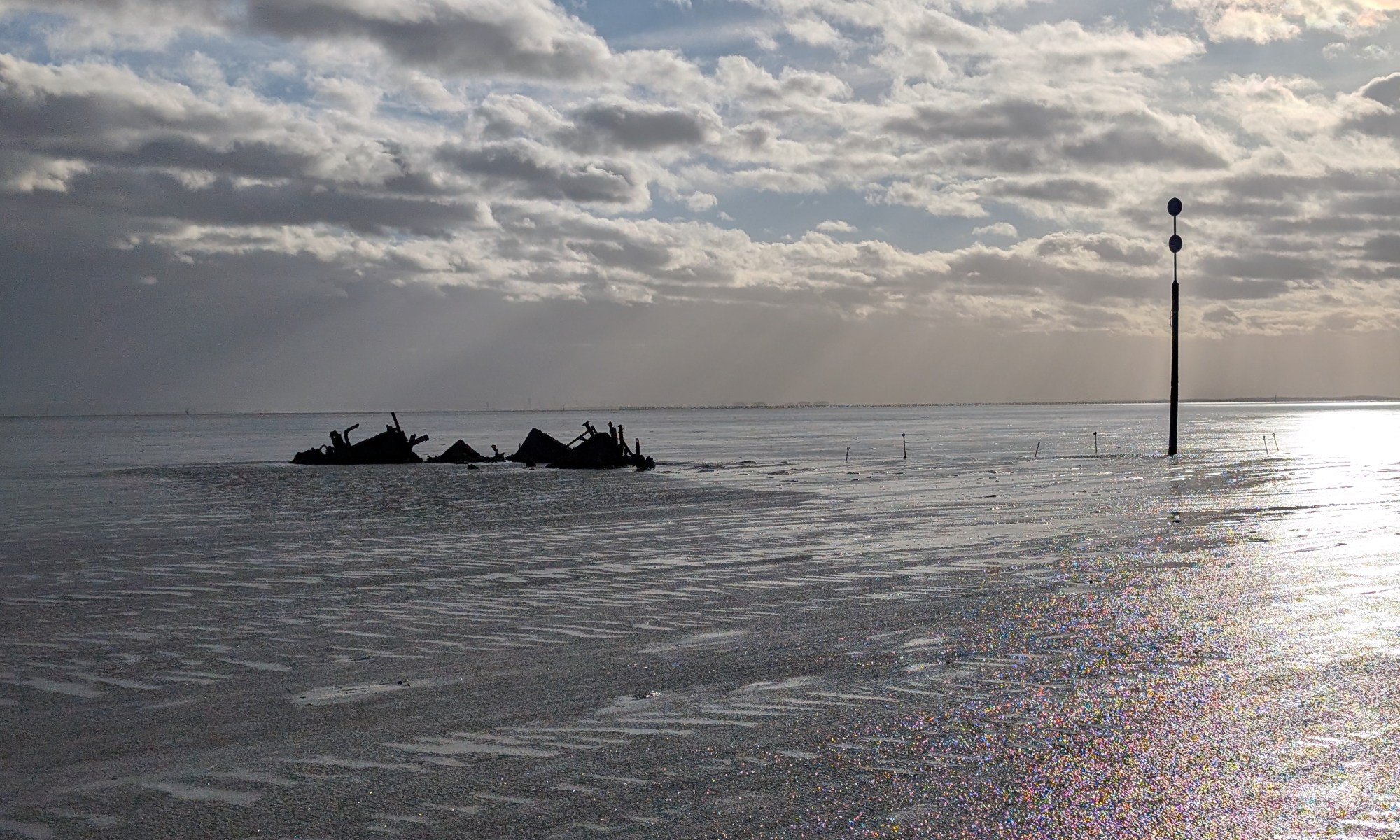 Walking on to the sands, the view of a immense skyscape dominates as it is reflected in the water that remains in the channels and the surface, still seeking the sea as it flows east. It is very exposed and there is no shelter from a strong westerly wind that cuts a good measure from the tempreture. It is cold, but the wind blows us along the path to the first marker – the maypole, distinctive with its reflective discs and crossed battens. The group then progresses to one of the causeways at Asplins Head and heads back to the seawall for a snack. Exiting the sands at other points is dangerous, as the remnants of older rivers retain deep mud that could entrap you. This is where Kevin’s knowledge comes in hand, also his ability to call a coastguard with a VHF radio and mobile. If mist came in you would be disoriented and might end up walking into the sea on a rising tide.