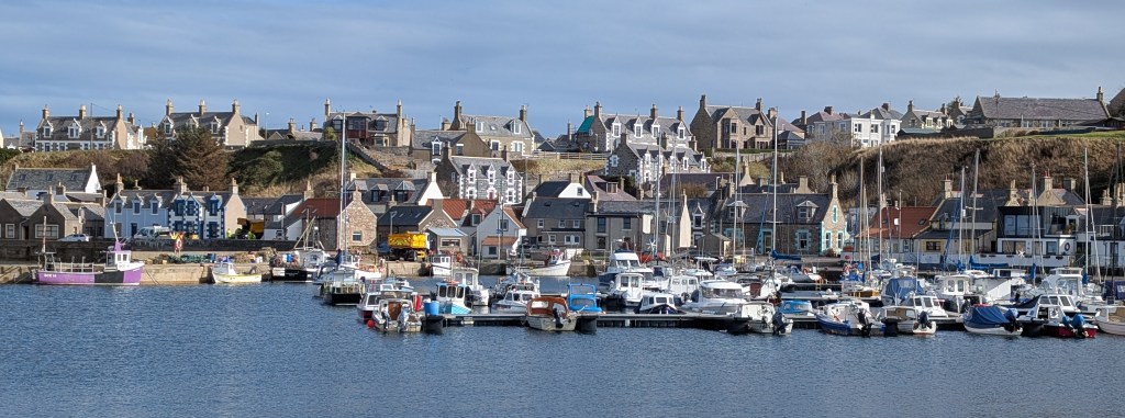 After a restless night on the Calendonia Sleeper seat, a connection to Keith, and a bus to Cullen, I was a bit jaded, but determined to reach Buckie and get those legs working. I am now shod with a new pair of Meindl Bhutans, which at £300 will have to deliver on the later tough sections. For now the path east from Cullen is signposted with delightful Fulmar seabird symbols, and the local community ‘Friends of Cullen’ have provided a water point to fill up my flask, before I explore the shoreline, scambling around a headland at high tide to join a good path to Portknockie. The harbour is a model layout for almost every coastal village east, sheltered from the worst weather, that the inhabitants would have experienced a week earlier, when Storm Amy ravaged this area.