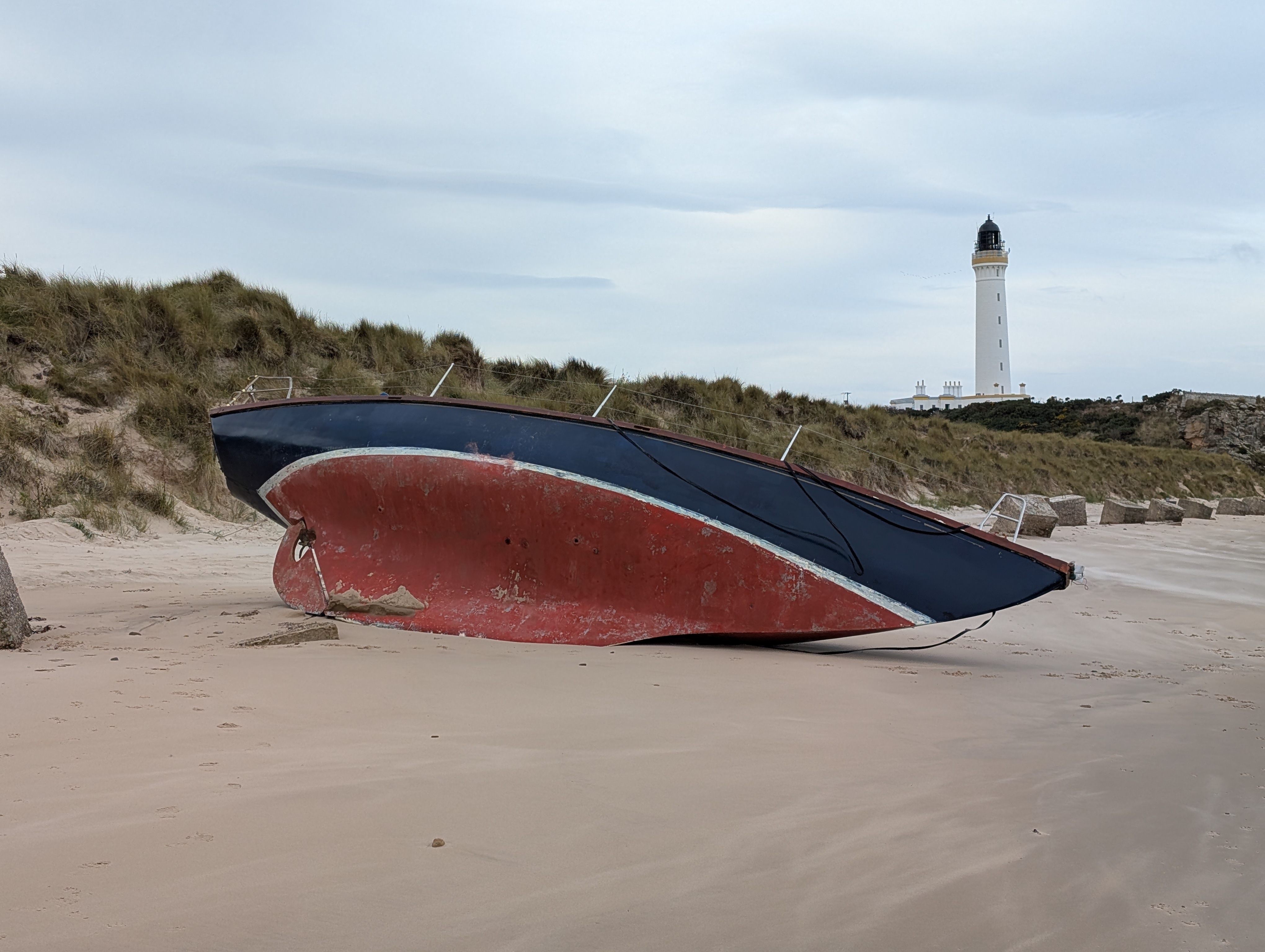 Or so I thought, for a strong westerly plagues my progress in the morning. I lean in, using my tattered poles to bring triceps into the walking equation. An empty yatch lies beneath the lighthouse, a victim of an earlier storm. I can rest in the lee of the cliff for a moment before climbing to the cliff side path through gorse hedges, which bring some relief to Hopeman, a lovely secret beach resort, and then Burghead marked by a monstorous malt factory (feeding the whisky stills of the area). I stop for lunch and then enter a wind free zone of Roseisle Forest, with endless cone and needle paths through tall firs.