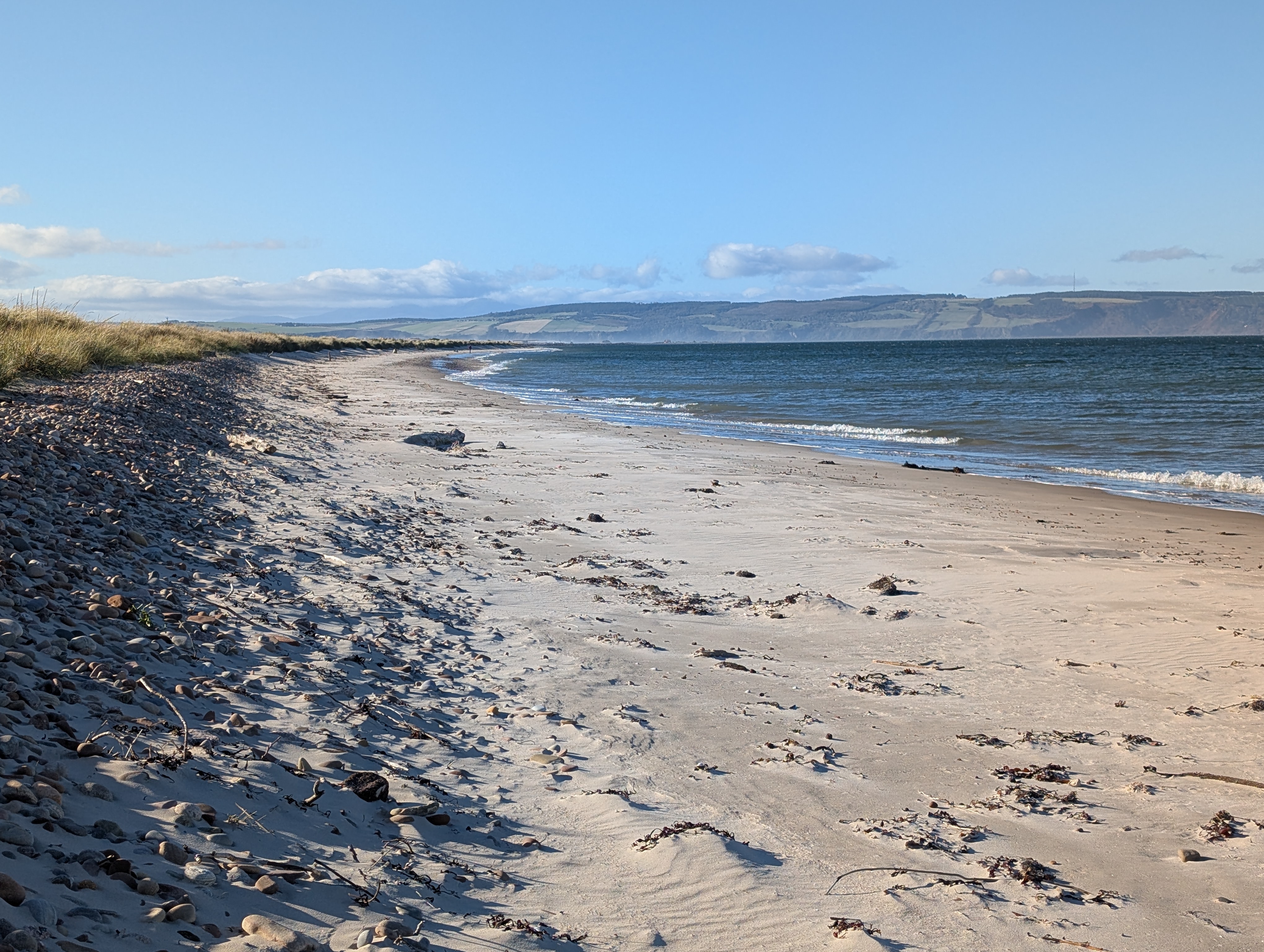 The walking is easy, and I do not have to think about navigation as I pass through Findochty to Buckie, where a run down hotel provides a simple bed with a sea view for the night. I start to recognise the Speyside Way I walked some years ago the following morning, walking along an old railway line towards Spey Bay, taking a diversion along the shoreline to avoid the Links woodland blocked by fallen trees, yet to be cleared. I am hoping for a cuppa, but the nature reserve cafe is closed. I find a cafe in Garmouth after crossing the old rail bridge and adopt a relaxing pace along the path behing the shingle bank towards Lossiemouth, occasionally climbing the bank to scan the sea for dolphins and seabirds. I arrive with enough time for an afternoon nap. I am easing my way into the early miles, for I have another 200 miles or so to do, and they will not be as easy going as this.