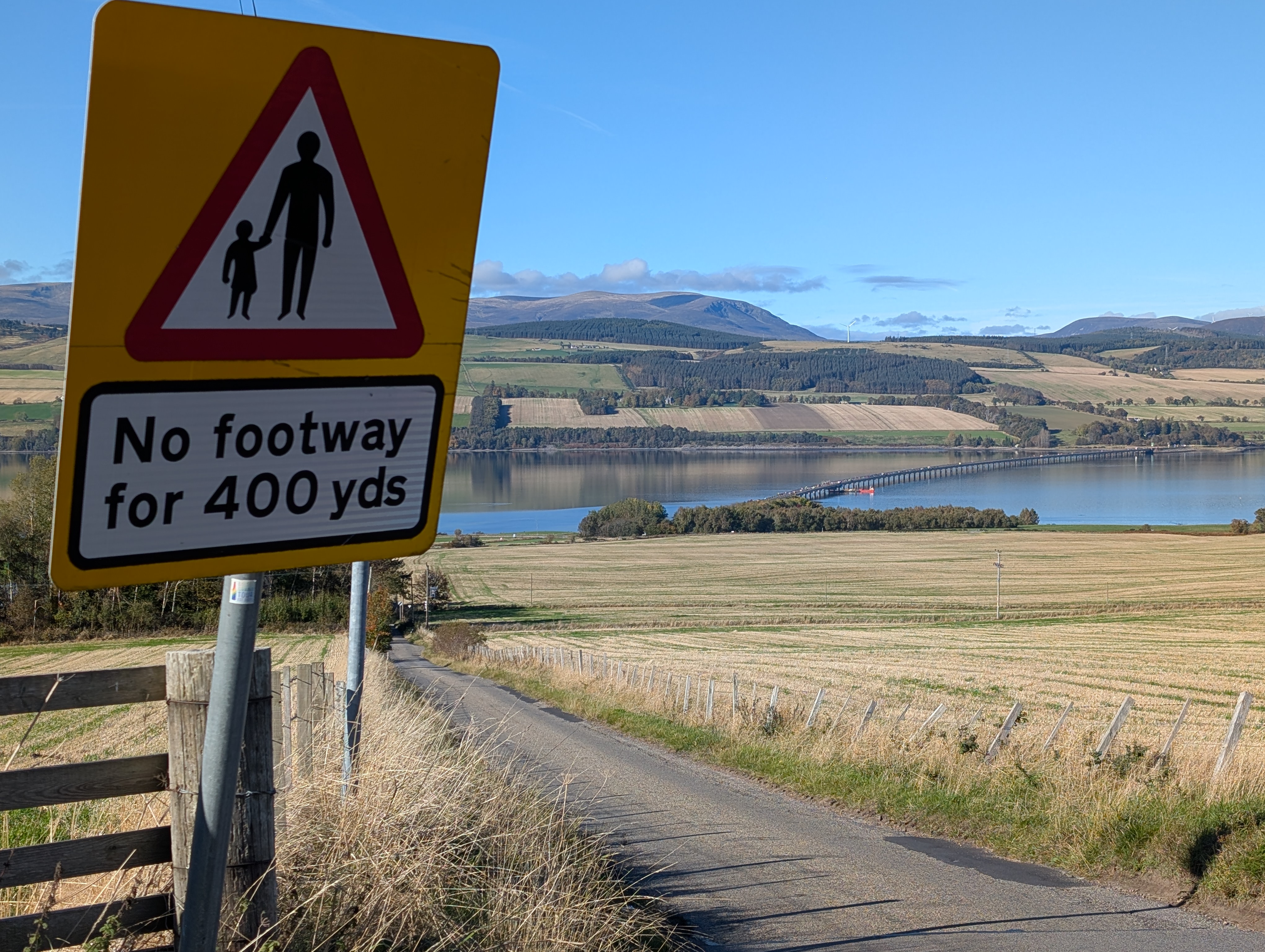 No more busy roads, as I join the John o’Groats Trail (JOGT) in the morning, walking over Kessock Bridge and into the woodlands towards Munlochy, or so I thought, as I take a wrong turn and add an extra mile or so to the day! No bother. The weather is great and the roads empty of traffic. I takes a while to reach the Cromarty Bridge and further roads to Alness for the night, before a repeat day on endless roads to Tain. I counted 30 cars in 12 miles, so it is safe enough, but I welcome the crossing of the Dornoch Firth and the woodland walk into the Royal Burgh. I camp at the site, knowing the days ahead will be very different.