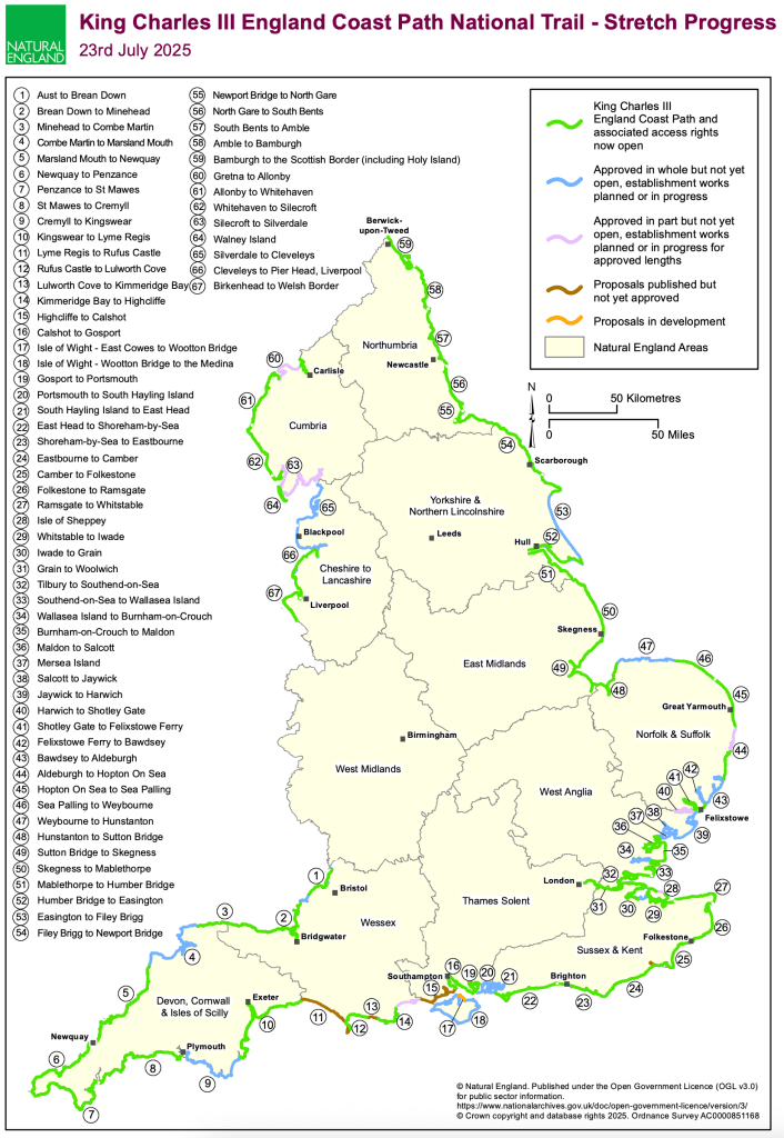 The new King Charles III England Coast Path will be completed in 2025. I walked much of what had opened between 2021 and 2024, taking public ferries mostly, but returning later to walk estuaries and islands as the formal paths opened: Essex estuaries, the Solent Way, and other small sections unwalked. I walked 2,300 miles in 110 days, yet the KCIIIECP should be 2,687 miles when fully open. The Natural England overview map beow gives current status, and I will update this from time to time. The definitive status can be found on the www.gov.uk website.