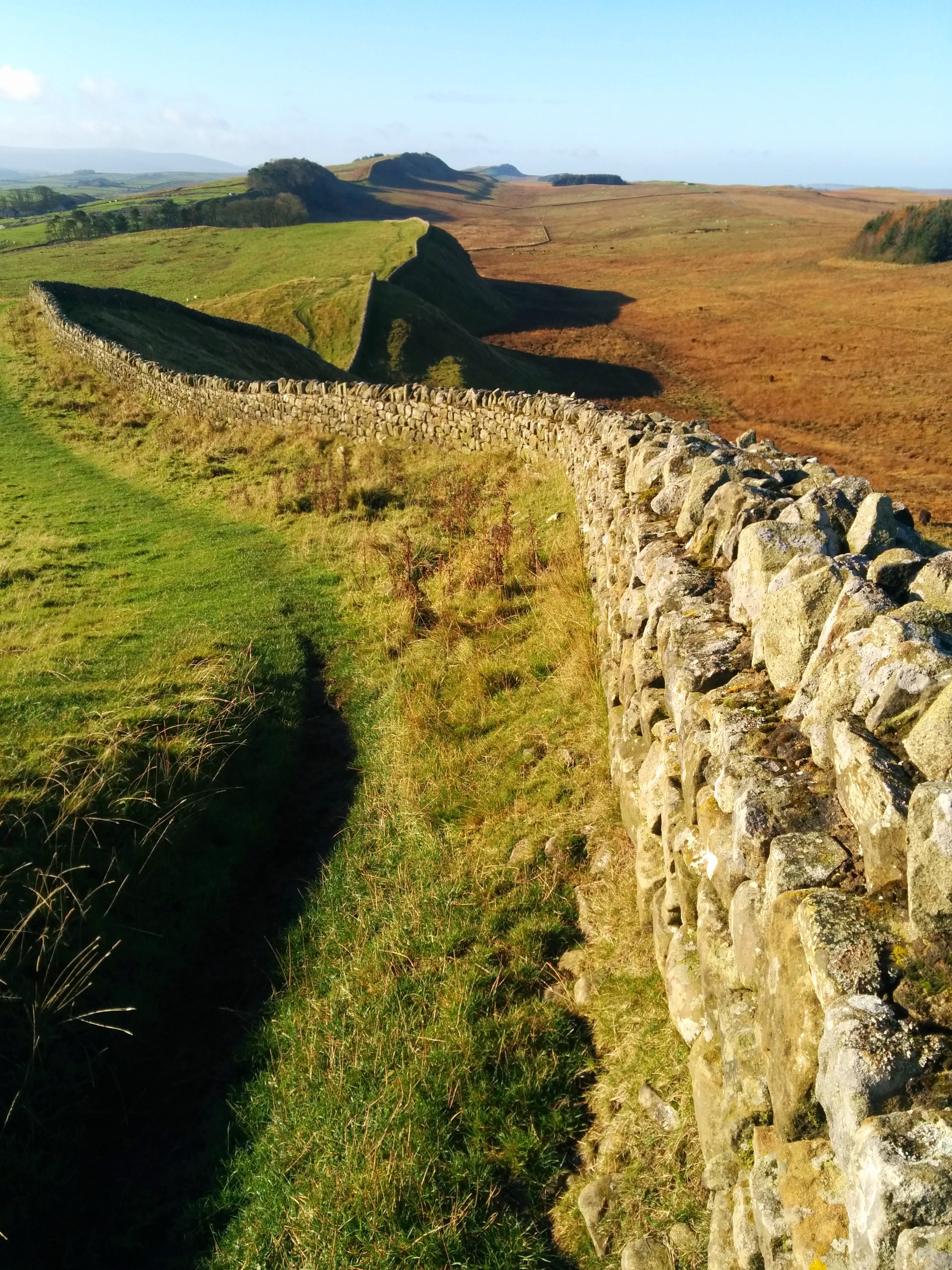 Super breakfast and the obligatory natter, set me up for the best day. The weather was clear and bright, with good visibility and dramatic skyscapes. The wall is very much in evidence now with the road taking a back seat. Greenfields to the south, brownfields to the north, why, I do not know. Stunning views of the wild and windy landscape, with a beautiful light, you couldn’t fail to take a nice picture. So it was no surprise to meet a professional photographer, from New York, taking stock photos. He could have done with a decent pair of boots though as the bare soles he had, meant he was slipping all over the place. I passed just one other HW walker before reaching the postcard sites at Housesteads and Steel Rigg and stopping for lunch at a Trig Point. Still-air was broken by an RAF Tornado, on exercise, screeching through the sky. The next section ran with The Pennine Way until Greenhead, where I continued on the path to Gilsland and a nice Inn.